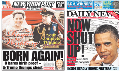 The New York Post and Daily News ran headlines “Now Shut Up!” next to Obama’s face and a birth certificate, although I don’t believe the President would actually say that. However, just in case you weren’t sure if Obama was taking a shot specifically and the Donald, he made a speech on Saturday, at the annual White House Correspondents’ Association Dinner, in front of 2,500 people.