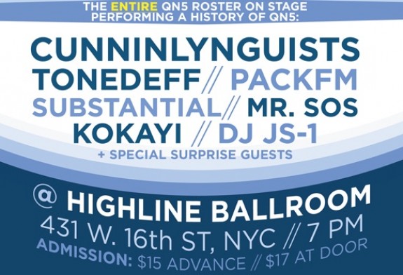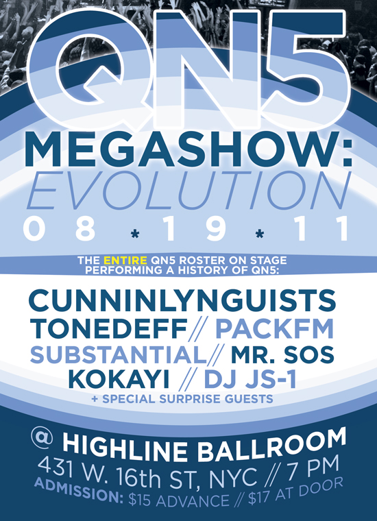 2011’s Megashow marks a pivotal turning for us, as we celebrate a decade-plus of musical independence and multiple critically acclaimed releases. To mark this occasion, this year’s theme is Evolution. Eschewing the traditional ‘one by one’ line-up of previous years, the collective will be performing a ‘history of QN5’ in a collaborative format – year by year – that reaches for a peek into the future as well. Along the way, there will be plenty of special guests, special treats, and energy that have made the QN5 Megashow THE Hip Hop showcase of the year.