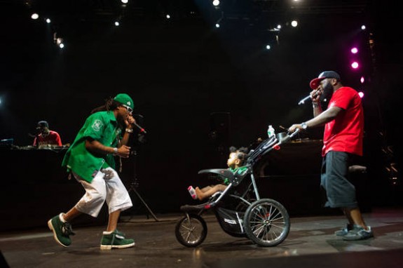 Lyricist Lounge team on July 9th 2011 as part of the Celebrate Brooklyn series. The Bootcamp veterans put it down for the Duck Down family. Tek came onstage with what seemed like his daughter in a baby carriage, then picked her up and rhymed with her in his arms. Â According to DuckDown.com the label’s official site, that was actually Sean P’s daughter – “Shaun P” – and later Buckshot hit the stage for a verse with his own daughter in his arms as well. The duo were joined onstage by Sean Price and Rock of Heltah Skeltah and performed both classic material and new stuff off their new album, Monumental, produced in it’s entirety by legendary triple threat, beatsmith, MC and DJ, Pete Rock.