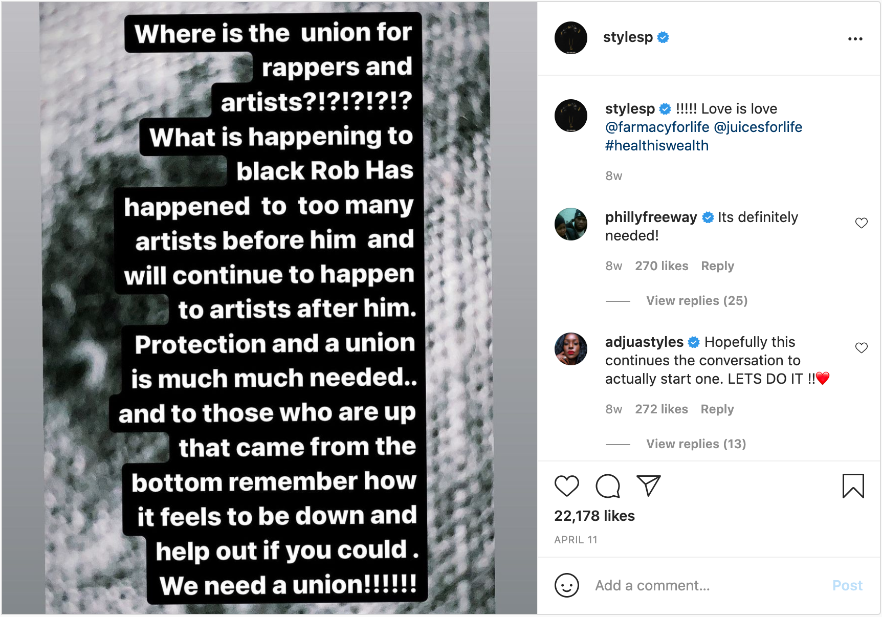 “Where is the union for rappers and artists?!?!?!?!? What is happening to black Rob Has happened to too many artists before him and will continue to happen to artists after him. Protection and a union is much much needed..and to those who are up that came from the bottom remember how it feels to be down and help out if you could . We need a union!!!!!!!” he wrote.