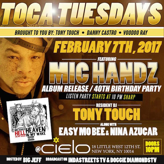 Sounds will be provided by EASY MO BEE, resident DJ TONY TOUCH & special guest DJ NINA AZUCAR! Starting at 10pm will be a special Listening Party for MIC HANDZ’ album for VIP’s & ALL MEDIA! Hit Handz on his Facebook page for more info.